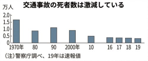 警察庁が今月発表した、2019年の交通事故の死者数(速報)は3215人で、5年前に比べて2割減った。3年連続で戦後最少を更新しており、対人の損害を補償する自賠責の保険料引き下げにつながった。一方で、任意加入の自動車保険が補償する相手の車両や電柱など対物事故の保険金支払いは17年度で13年度に比べて2%増えた。自分の車の損害を補償する車両保険の支払いは減っているが、4%減にとどまる。