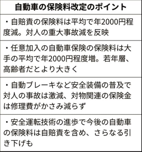 交通死亡事故が減少するなか、自動車保険料の負担軽減には時間がかかりそうだ。金融庁は22日、自動車損害賠償責任保険(自賠責)の保険料を4月から年2000円程度引き下げることを決めたが、損害保険大手の任意加入の自動車保険料が同程度上がったからだ。普及が進む安全装置の修理費が高く、任意保険の保険金支払額が減っていないという事情がある。