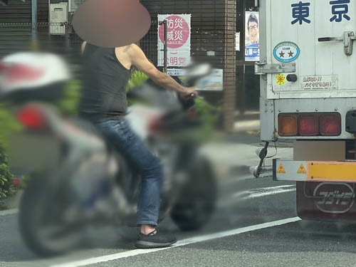 よほど慣れた方なのでしょうか。タンクトップに短靴に手袋ナシ。いくらなんでもこれはヤバくないですか……。自転車でコケてもズルズルに剥けて傷口がハムみたいになりますからね。速度の出るバイクでコケた日には、ハムを通り越してミンチになっちゃいますぜ。