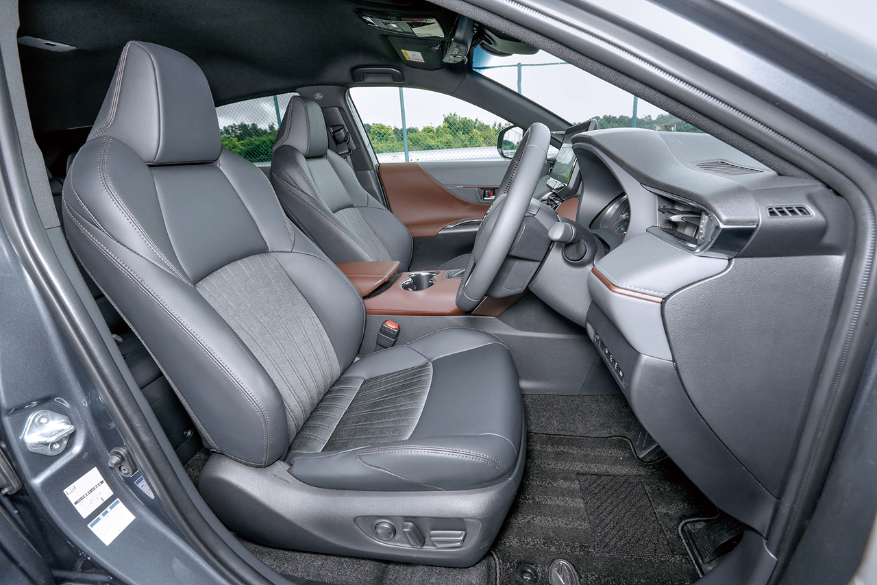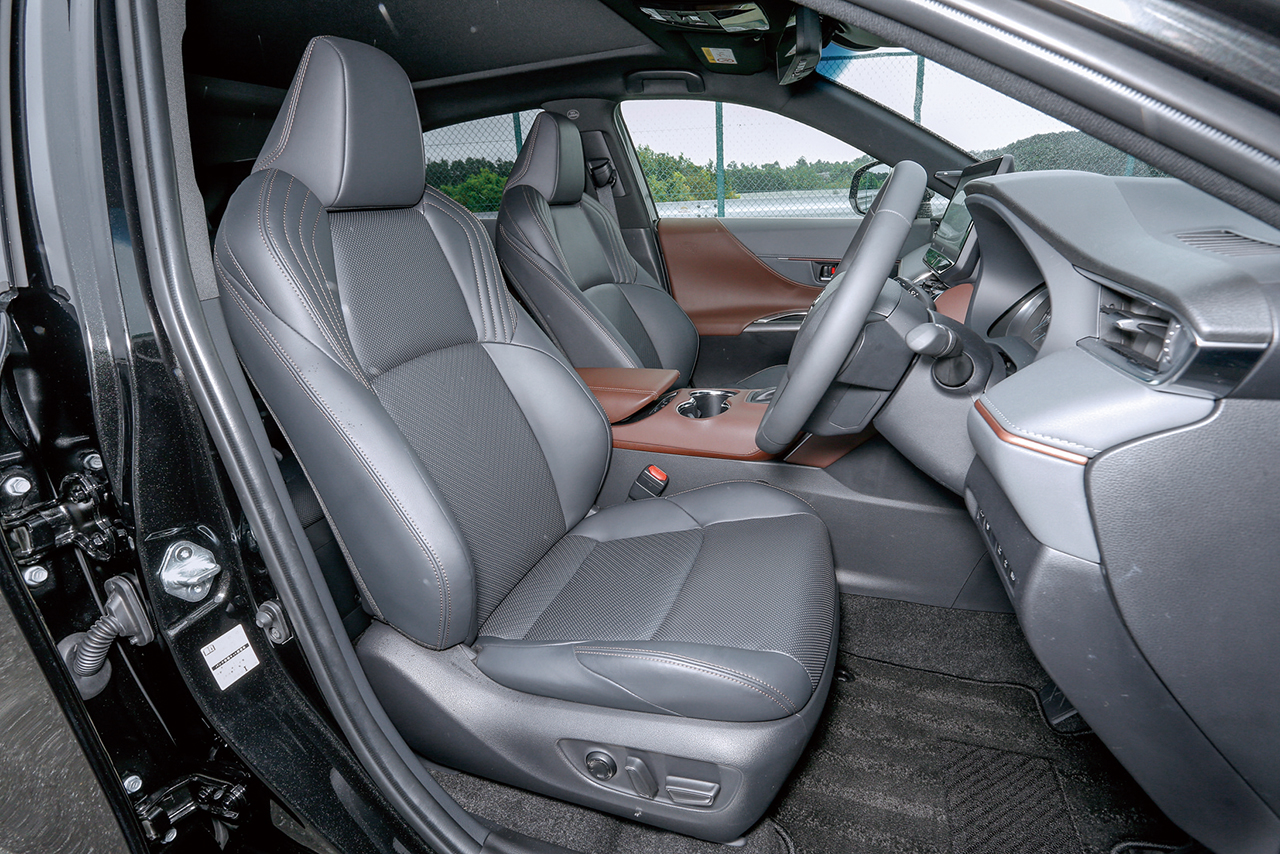 GとZに設定されるレザーパッケージ車は、ステッチが刻まれる本革シートが備わる。取材車の内装はブラウンだが、別にブラックも選択可能だ。