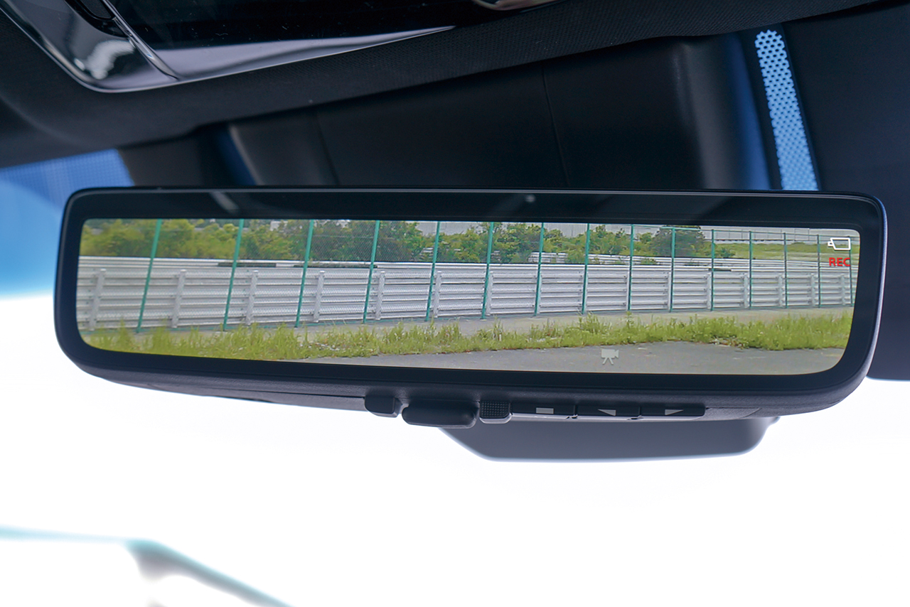車両後方カメラの映像をミラー内に表示するデジタルインナーミラー。ハリアーでは前後方録画機能も追加された。