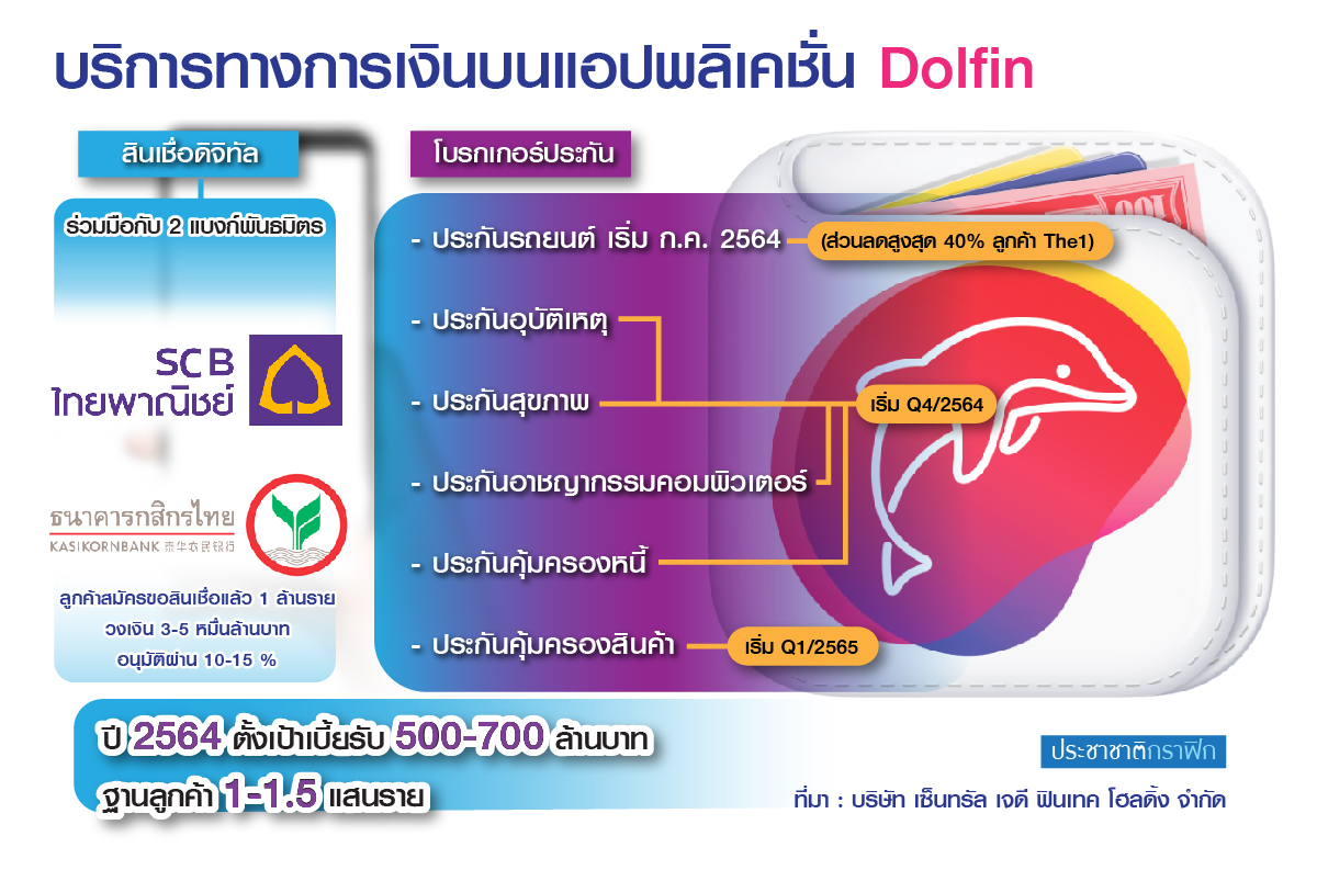 “โบรกเกอร์ประกันภัยถือเป็นหนึ่งจิ๊กซอว์สำคัญของเครือเซ็นทรัล เจดี ฟินเทค ที่จะช่วยเพิ่มรายได้ต่อจากนี้ เบื้องต้นเราวางโปรดักต์ที่จะขายเป็น 3 แกนหลัก คือ แกนที่ 1 สินค้าคุ้มครองทรัพย์สิน (asset protection) โดยตั้งแต่เดือน ก.ค. 2564 เราจะเริ่มขึ้นระบบวางขายประกันรถยนต์บนแอป “Dolfin” ให้ส่วนลดสูงสุด 40% สำหรับลูกค้า “The1” ซึ่งปัจจุบันได้พูดคุยกับบริษัทประกันวินาศภัยเกือบหมดแล้ว ตอนนี้อยู่ในช่วงเชื่อมต่อระบบหลังบ้าน คาดว่าประมาณ 6-7 บริษัทจะเริ่มขายได้ก่อน”